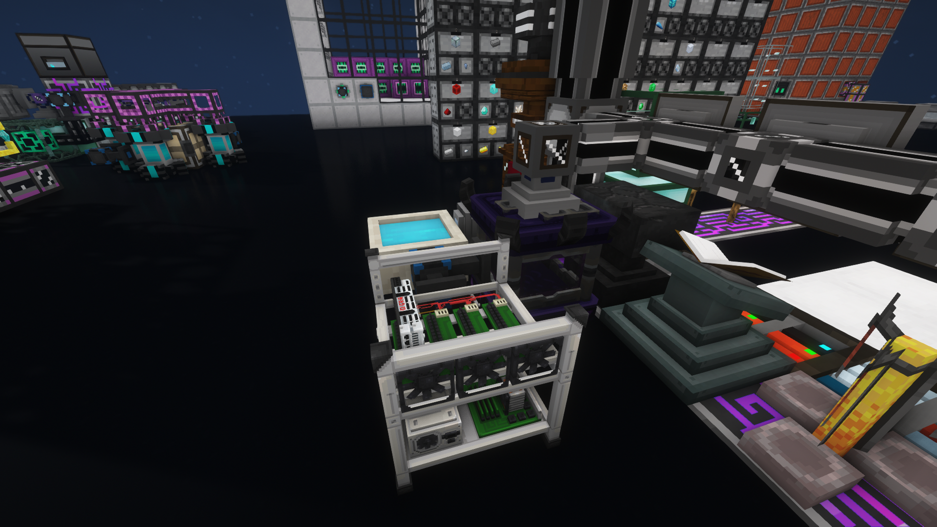 Огромное количество собственных разработок, включая механизмы быстрого крафта способные крафтить тысячи единиц предметов в тик, которые полностью интегрированы в МЭ сеть и дробят/жарят/варят прямо в ней. Забудьте про крафты по несколько часов солнечных панелей последних тиров, к которым вы привыкли на других проектах, у нас можно крафтить солнечные панели за считанные секунды, благодаря переписанной нами логике работы мода AE2.